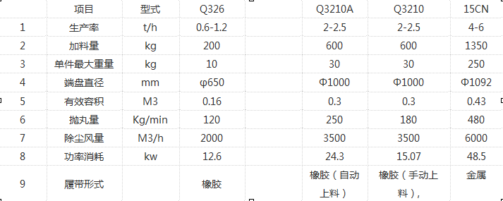 履帶式拋丸機(jī)分為Q326、 Q3210、Q3220、15GN等型號(hào)。其中Q326/Q3210為橡膠履帶式拋丸機(jī),Q326端盤直徑為650mm,一次性額定處理200KG。Q3210端盤直徑為1000mm,一次性額定處理600KG。Q3210又可選擇自動(dòng)上下料式。Q3220為2個(gè)拋頭定制型,15GN為自動(dòng)上下料鋼履帶拋丸機(jī)。