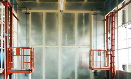 1、清理室體:本室體由鋼板焊接成型,外部用型材加固,保證噴砂房體的牢固性。外部用巖棉夾芯板制作而成,結構堅固,又能降低噪音。噴砂室體內壁襯有耐磨橡膠護皮,保護室體內壁免遭彈丸打擊,防止彈丸飛出傷人;室體內兩側及室體后端均設行走平臺以便清理作業(yè);平臺采用活動鉸鏈式連接,當工件太大或不需要用時,可以將平臺放下以增加操作空間。在室體進口設有兩扇大門,當工件進入室體進行噴丸時,將大門關閉,以降低噪音,并防止粉塵等的污染。室體除塵風口設置采用“上送、下吸”的原則,使含塵氣流盡量向下部積聚,以增加操作人員的能見度。